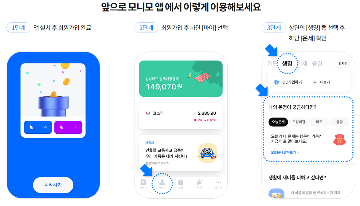 마지막으로 알려드리는 곳은 삼성생명에서 운영하는 모니모라는 앱입니다. 요새 이 앱도 광고를 많이 하던데 운세도 볼 수 있네요. 확인해보니 미니운세, 재물, 애정, 로또운, 행운의 숫자, 색깔운 등등 다양하게 이용할 수 있고, 운세뿐 아니라 다양한 이벤트도 하는 걸로 보여지는데 다운받아 보시길 추천드립니다.